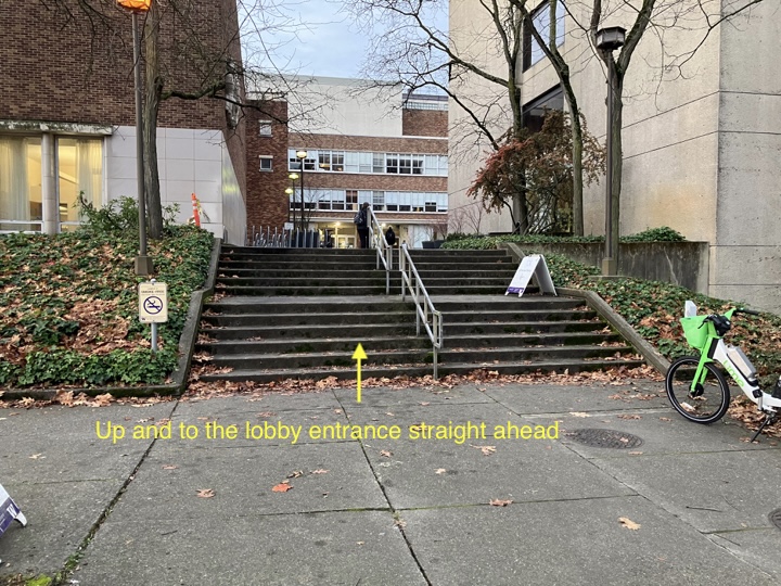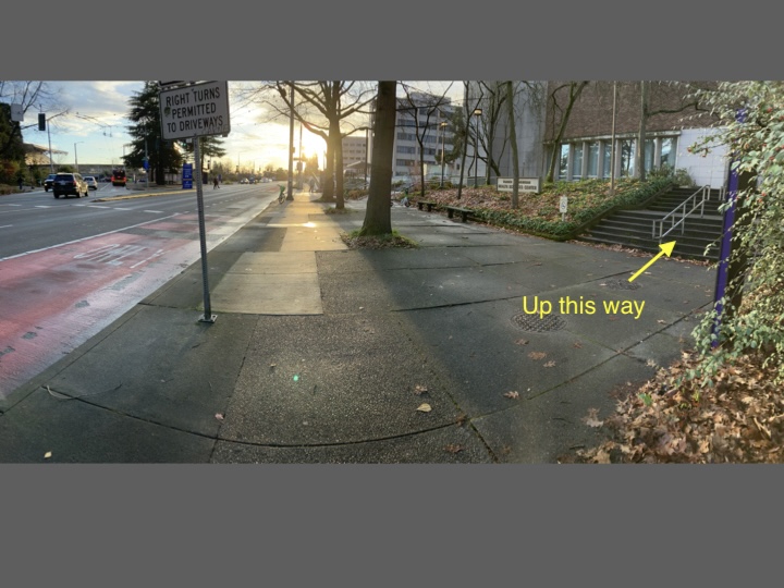 Just before that intersection, turn right and head up the stairs to Magnuson Health Sciences Center.