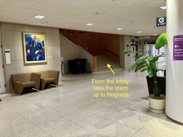 As you enter the lobby, you'll see a staircase on the left going up one floor from the lobby to Hogness Auditorium (HSA-A420). There is also a somewhat hidden elevator, but it doesn't always work. |