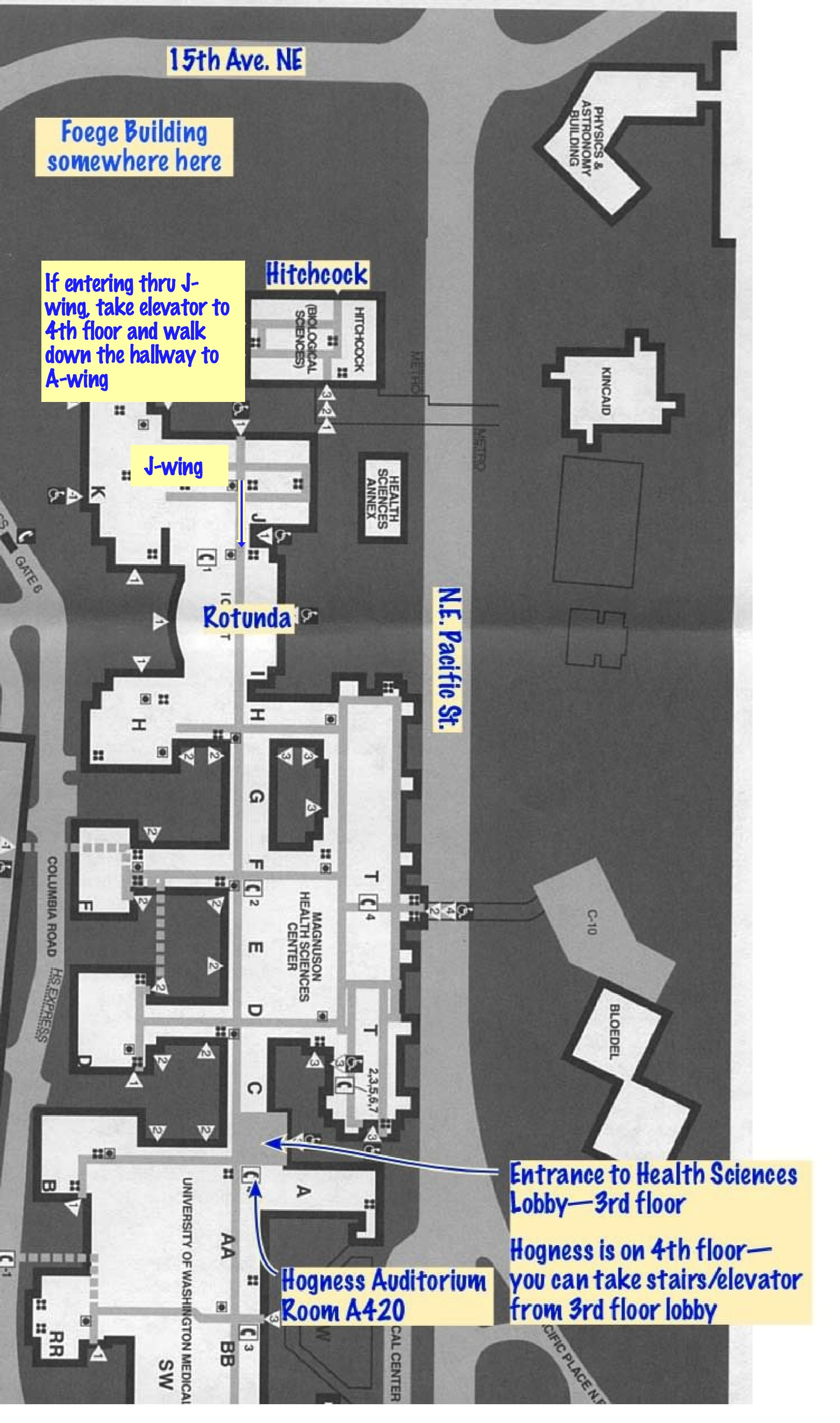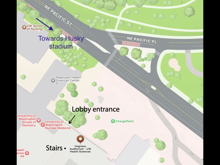 Getting to Hogness Auditorium: One way is to go along the sidewalk on NE Pacific (the same side as the Health Sciences building) towards Husky Stadium until you come to NE Pacific Place intersection. (Alternative route: You can also go into the J-wing of HSB, directly across from Hitchcock, take the elevator to the 4th floor, and walk down that very long hallway until you see signs for Hogness Auditorium. Or take the T-wing overpass from the Burke Gilman trail into HSB T-wing 4th floor and work your way to Hogness.) |