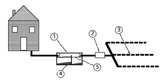 in your answer. 16. For people living in rural areas municipal sewage treatment is usually not feasible. These families typically must dispose of their sewage on their property. A typical on-site sewage system is depicted below. Identify the five major component parts of the system and explain the purpose of each, and then explain how the system as a whole, serves to prevent pathogenic organisms present in sewage from coming into contact with human populations.