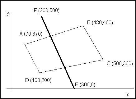 intersection of line E-F and side A-B and of line E-F and side D-C. Coordinates are indicated in feet (x,y).
