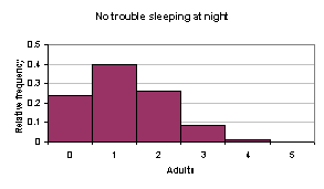 (f) The average number of adults, out of 5, that say they have no trouble sleeping at night is 1.25, with a standard deviation of .968246. It would be unusual to find 5 out of 5 adults that said they had no trouble sleeping at night.