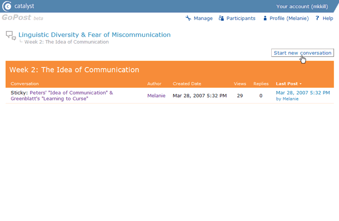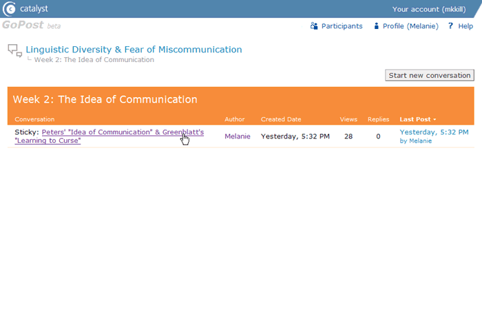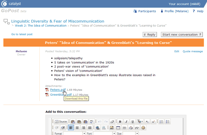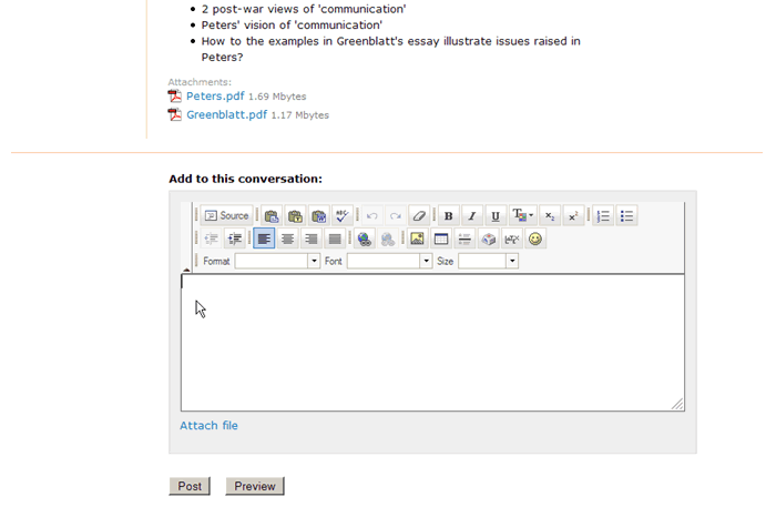Click the discussion area for the week and then the conversation that I have started with the week's readings as the subject line. In the opening posting of this conversation, you will find a posting with the week's readings attached in pdf format (print these!) and a list of questions and/or topics from the readings that I'll expect you to be prepared to discuss when we meet. If you have questions for your classmates about the readings or want to share related ideas, please post in this conversation by replying in the 'Add to this conversation' field at the bottom of the page.