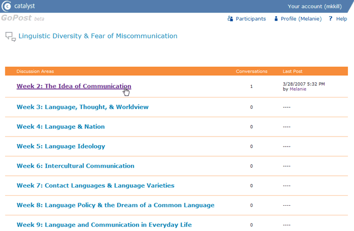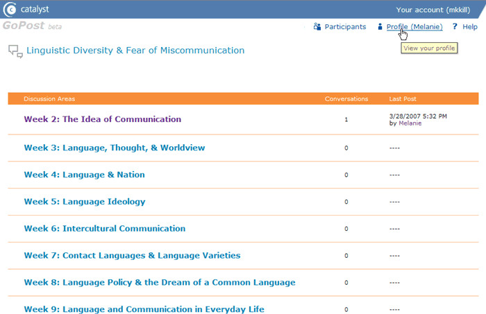 - Be sure your name is on each of your posts. If people have to work to connect an unfamiliar screen name to the person they know in class it is much harder to carry discussion topics and ideas back and forth between the discussion board and the classroom. (Filling in your profile information is also good for facilitating contact with your classmates.)