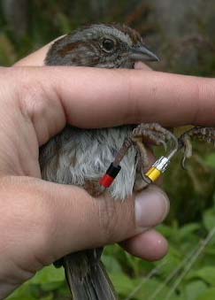 Color-banded Song sparrow (photo by K. Whittaker)