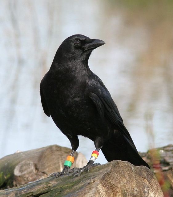 To report your sighting of a banded American Crow, read the following instructions then click this link to the report page. Once you have submitted the survey, your browser will automatically return you to the research homepage. When making crow observations it is extremely important that you correctly identify the exact color combination of the crow's bands. We typically band our crows with two bands on each leg. One leg will have two plastic color bands and the other leg will have a plastic color band above a metal (looks gray or silver) U.S. Fish and Wildlife band. In 2003 we started banding crows with 2 colors ABOVE the metal band, like the one pictured here. Make sure you note which bands are on the bird's right leg, which bands are on the bird's left leg, and which colors are on top (closest to the bird's body). Remember, if the crow has its back to you, its right leg is on your right. This bird has red over yellow over metal (USFWS band) on its left leg and orange over green on its right.