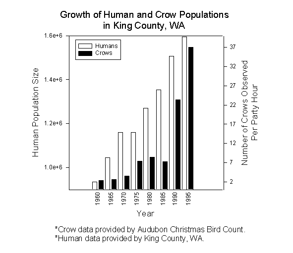 The population of American Crows in the Seattle area has increased along with the human population. This is not a coincidence, as crows generally require some human disturbance (i.e. garbage and habitat fragmentation) in order to achieve greater densities. In fact, peaks in crow density across North America appear closely associated with metropolitan centers.