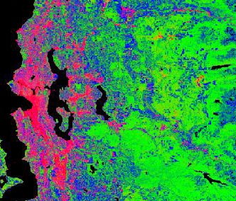 To cover the ranges of the urban spatial pattern metrics that exist in the Puget Sound area, we select many sites across a broad geographic area. Metric values for individual sites are calculated by interpreting the light reflected by the land cover. In this particular satellite image, red=impervious surface, green=vegetation, and blue=rock/soil.