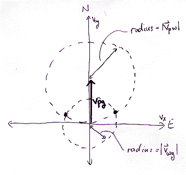 Well, sort of... the point of the problem is that the exact geometry of the vectors needs to be determined. What you know is that the vector equation v_wg + v_pw = v_pg holds, and that the vector v_pg = 150mi/h yhat. In the graph below, the dashed circle centered about the origin has a radius equal to the magnitude of v_wg, and the circle centered about the head of v_pg has a radius of v_pw. So, due to the constraints imposed by the magnitudes of the vectors v_pw and v_wg, a final picture of the vectors will have v_wg starting at the origin and ending at one of the intersection dots, and then have v_pw starting at the chosen intersection point and ending at the head of v_pg. You should be able to use either analytic geometry or the law of cosines to answer the problem.