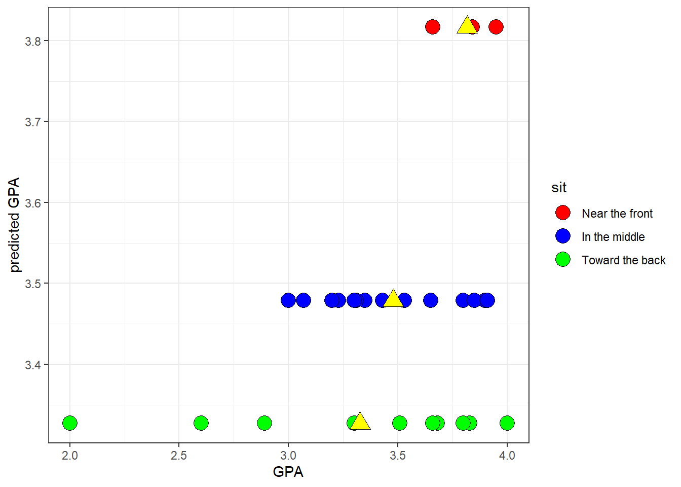 The scatterplot looks a little funny because there are only three levels of predicted GPA’s. That’s because, of course, the model predicts a specific GPA for each of the three levels of where students like to sit.
