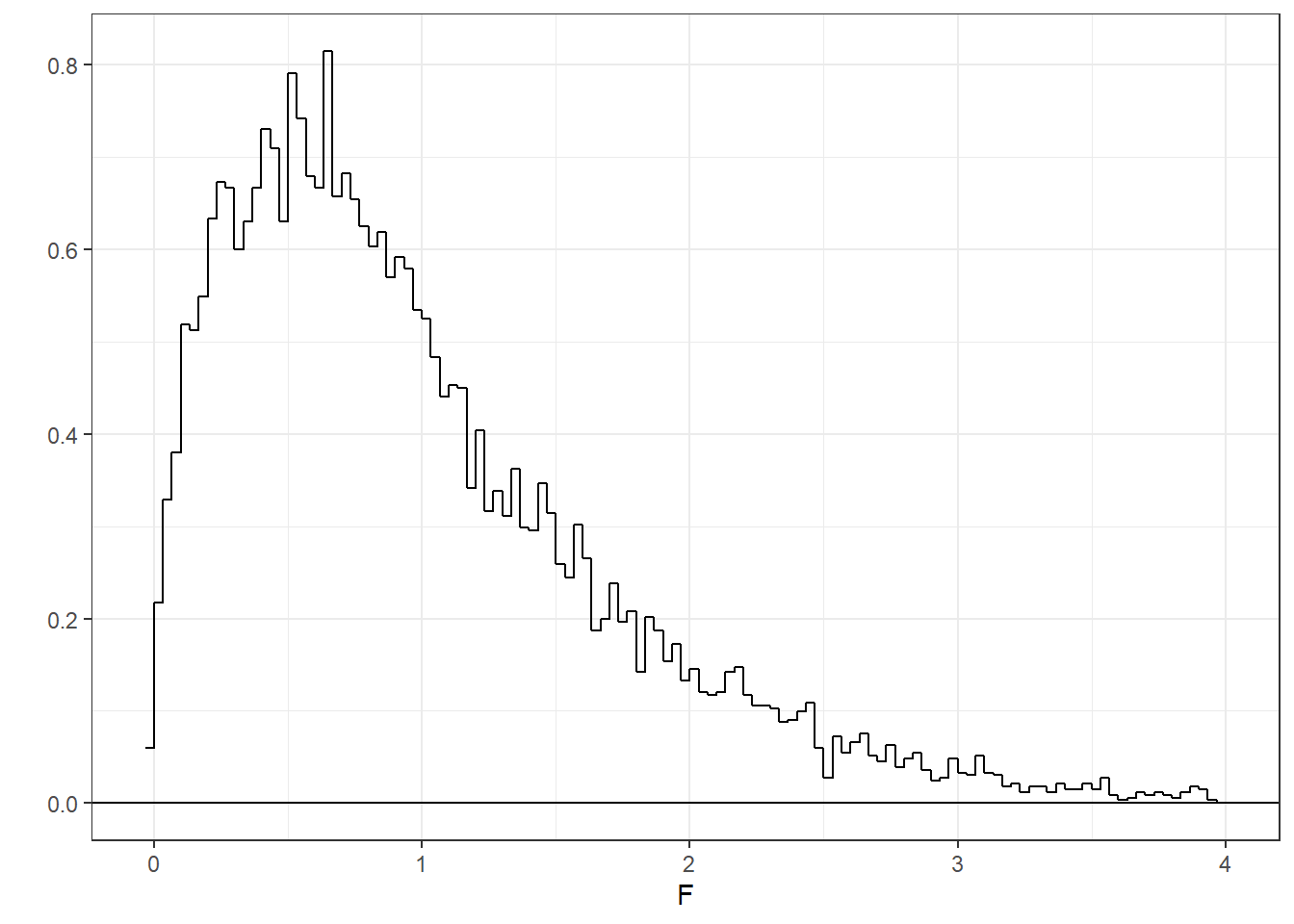 Let’s look at a histogram of our 10000 F statistics. I’m hiding the code so we can keep things moving.