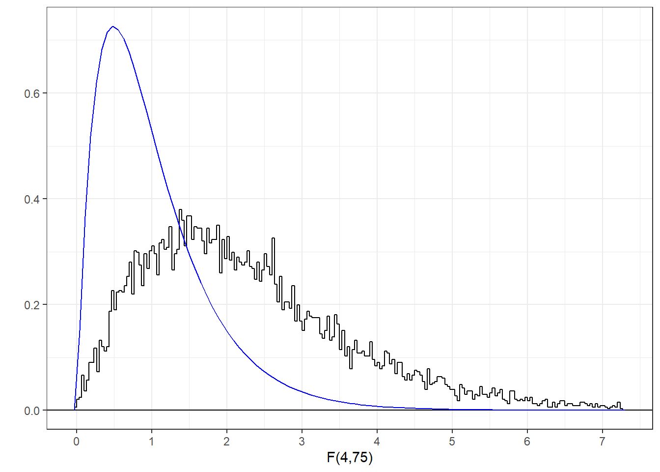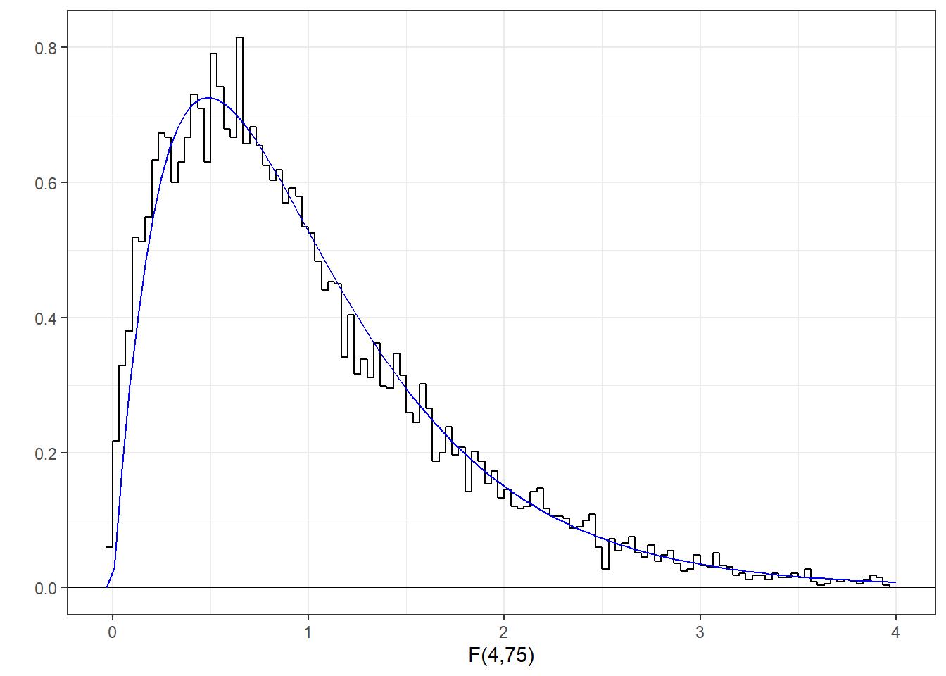 functions for normal and t-distributions. Here’s the histogram of our generated F-statistics along with the known F-distribution with 4 and 75 degrees of freedom.