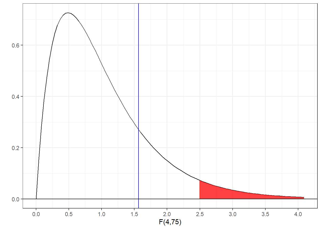 You can see that our randomly sampled F-statistics nicely fit the known F-distribtion. The F-statistic for our first randomly generated data set was 1.56. Where does this sit compared to the F-distribution?