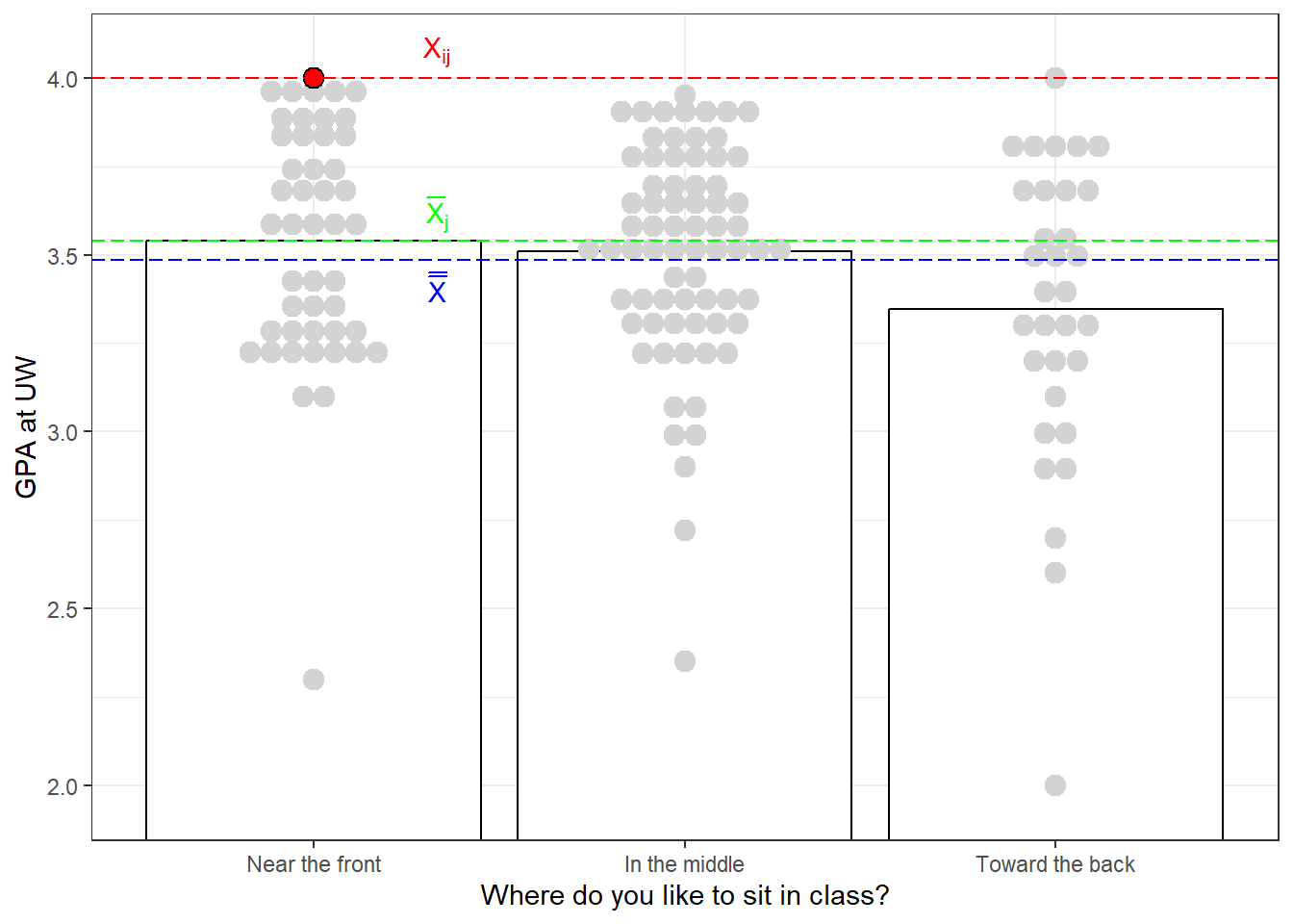 Consider the plot below which shows a bar graph of our survey data, but with each data point shown individually. I’ve highlighted a few values. First, I’ve picked out a single data point, \(X_{ij}\) which I’ve shown in \(\color{red}{\text{red}}\). The mean of the level that it came from, \(X_{j}\) is colored in \(\color{green}{\text{green}}\), and the grand mean, \(\overline{\overline{X}}\) I’ve shown in is colored in \(\color{blue}{\text{blue}}\)