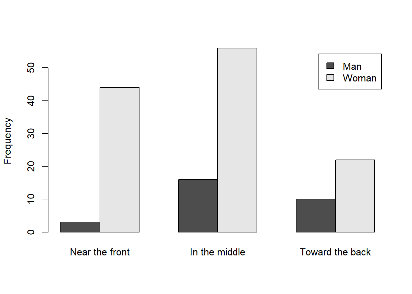 When teaching my big classes, I notice that the women tend to sit disproportionately up front and the men in the back. This is a thing? This will be another \(\chi^{2}\) test for independence using alpha = 0.05.