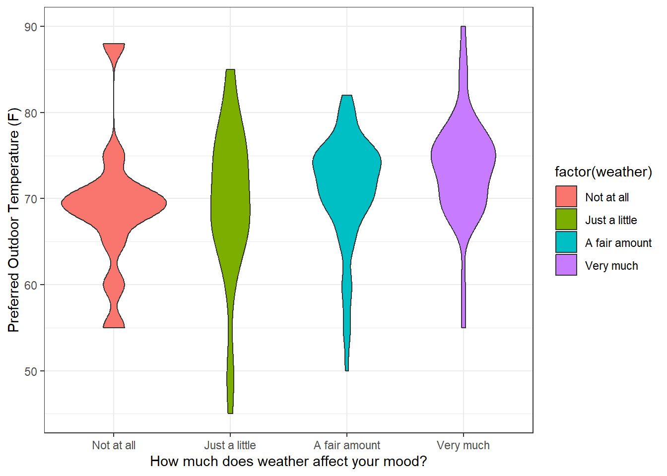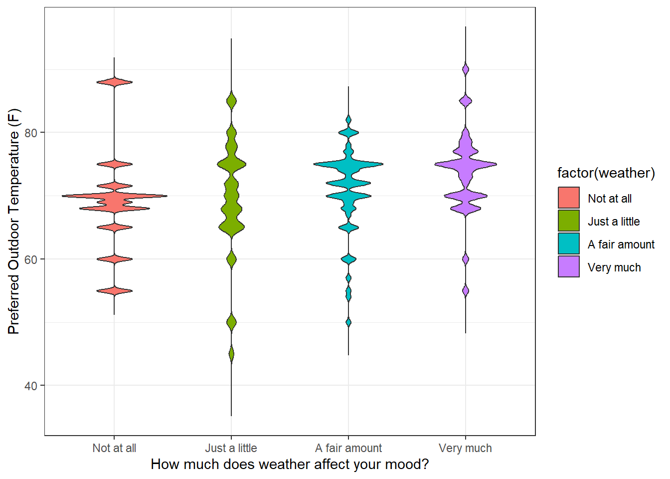 In this chapter we’ll explore various ways of representing the distribution of scores within and across groups. We’ll be using the survey data and compare the distribution of student’s preferred outdoor temperature grouped by how much they say weather affects their mood. We’ll be plotting graphs summarizing data in variety of ways, pointing out the strengths and weaknesses of each. Note: I stole some of this material from a post by Eamon Caddingan’s page titled ‘Violin plots are great’