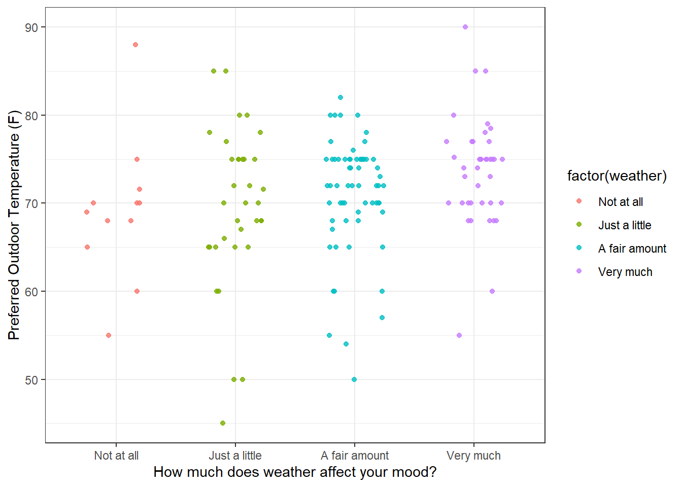 The most complete way to show the distribution of preferred temperature is to plot every observation as a data point. ‘geom_point’ will to this as a part of ‘ggplot’. ‘geom_point’ allows you to jitter the data points a little along the x-axis so that they spread out a bit. It’s a little weird to deliberately add randomness to your data in the process of visualization, but it works. Keep in mind that your plot will look a little different every time you run it since ‘jitter’ is using the random number generator (though you can fix that with the set.seed function) You can even jitter the ‘height’ of your data along the depend-variable y-axis, which is really weird and wrong, so don’t do that.