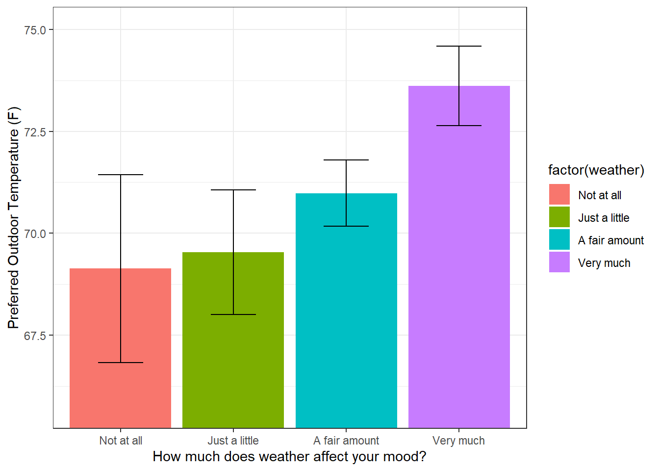 Note that preferred temperature (‘temperature’) is a continuous variable, while the response to the question ‘How does weather affect your mood?’ (‘weather’) is a nominal scale variable or what R calls a ‘factor’. So we can think about ‘temperature’ grouped by ‘weather’.