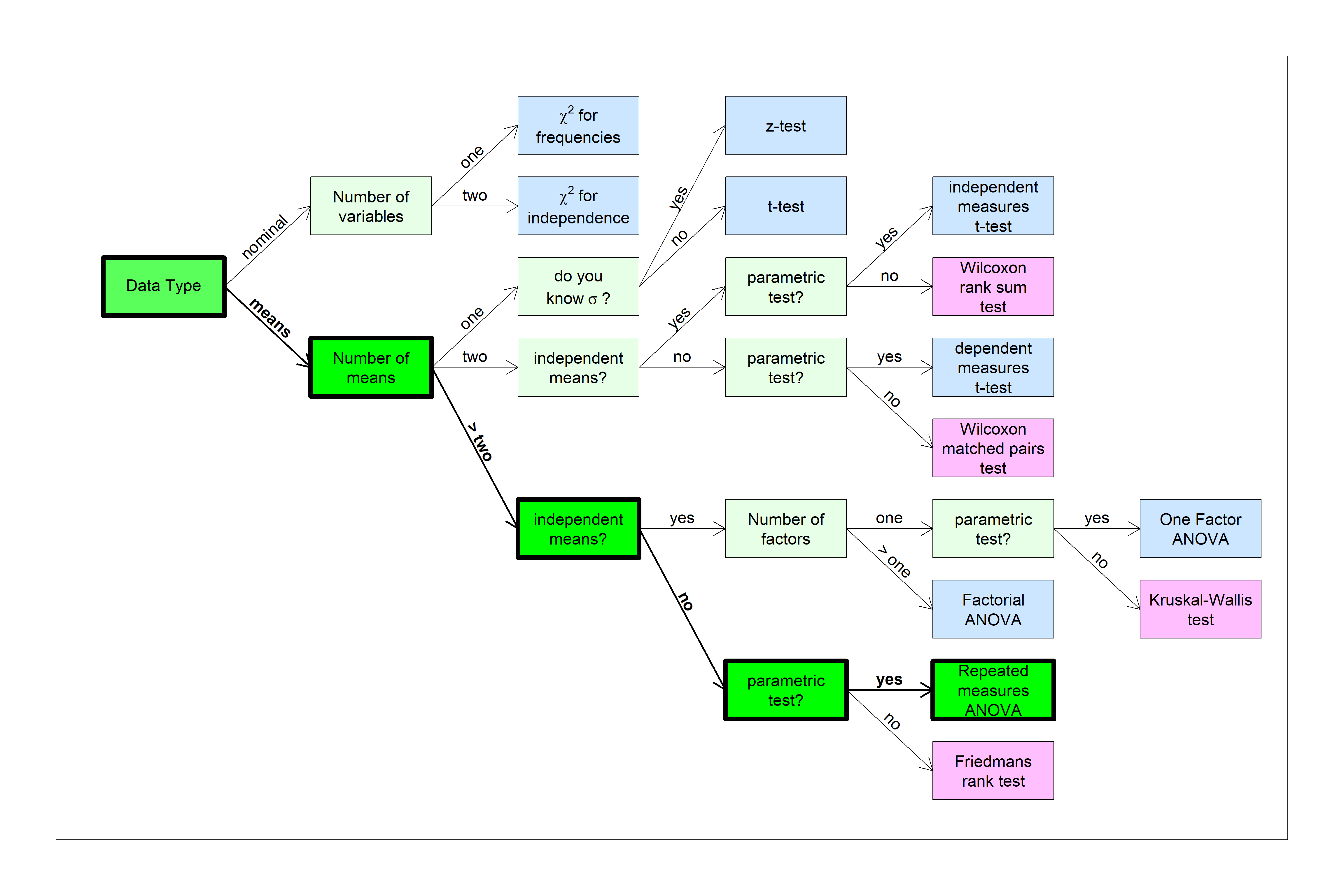 There isn’t a consensus on how Apriori and post hoc comparisons should be made with the repeated measures ANOVA. Since the difference between repeated measures and independent measures ANOVAs is the denominator, or ‘error’ term, you’d think that contrasts for repeated measures ANOVA would be the same as for independent, except that you’d use \(MS_{error}\) instead of \(MS_{within}\) in the denominator. However, apparently, this approach is too sensitive to violations of the assumption of sphericity.