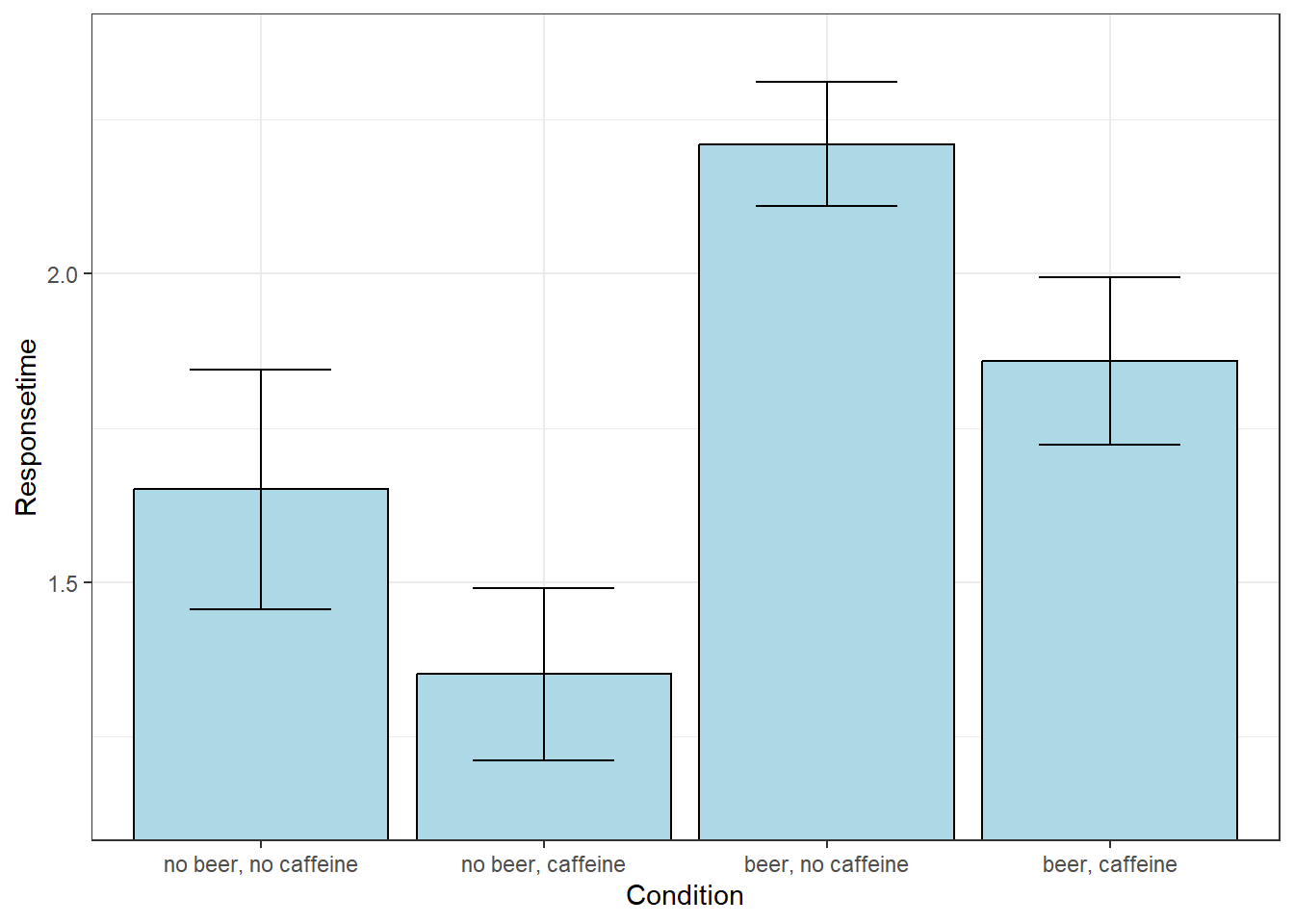 The four conditions, or ‘levels’ are “no beer, no caffeine”, “no beer, caffeine”, “beer, no caffeine”, and “beer, caffeine”