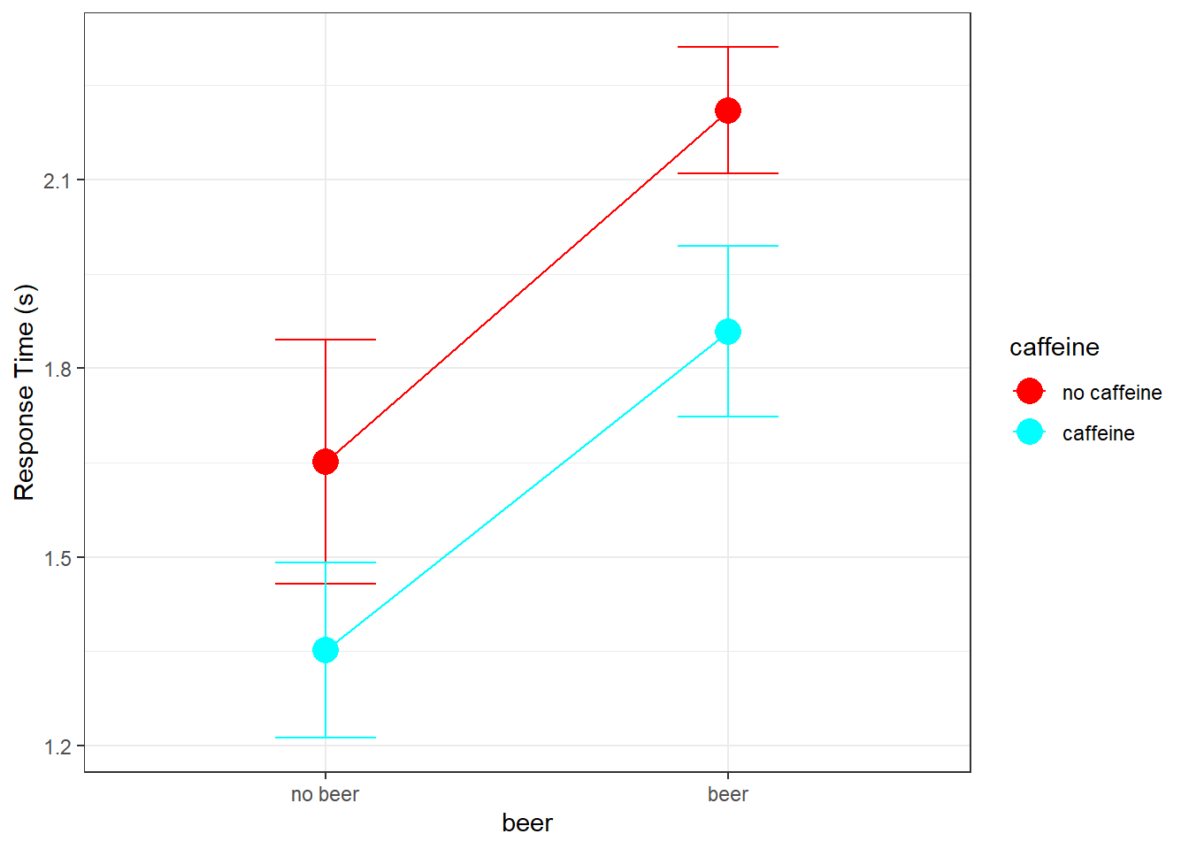 Suppose you want to study the effects of beer and caffeine on response times for a simple reaction time task. One way to do this is to divide subjects in to four groups: a control group, a group with caffeine (and no beer), a group with beer (and without caffeine), and a lucky group with both beer and caffeine.