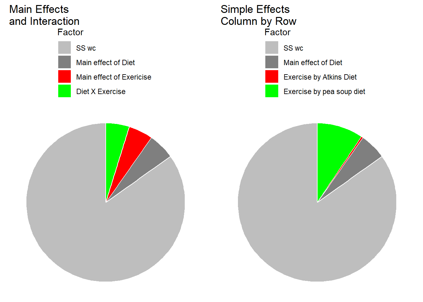 The pie charts below show how \(SS_{total}\) is divided up into the different sums of squares for the standard analysis (main effects and interaction) and for the simple effects analysis.