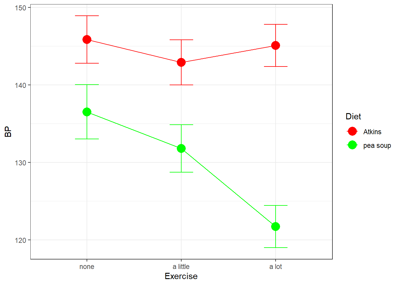 All three hypothesis tests are statistically significant, but this doesn’t really tell us much about what’s driving the effects of Diet and Exercise on BP. As discussed above when we plotted the results, what seems to be happening is that only the subjects on the pea soup diet are influenced by Exercise.